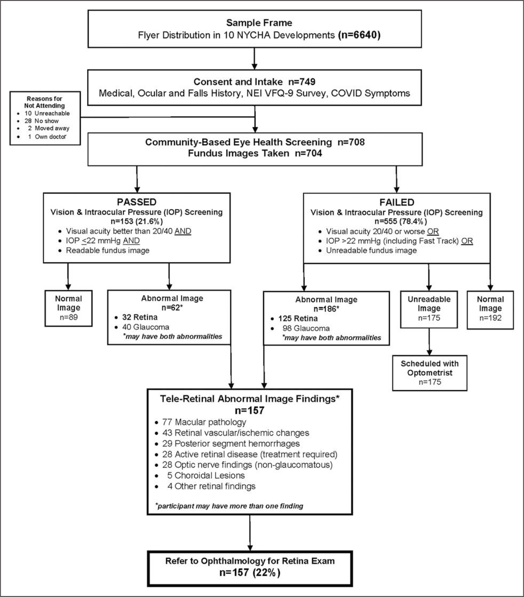 To describe tele-retinal abnormality image findings from the Manhattan Vision Screening and Follow-up Study (NYC-SIGHT), which aims to investigate whether community-based eye health outreach strategies using telemedicine can improve visual outcomes among at-risk populations in Upper Manhattan.