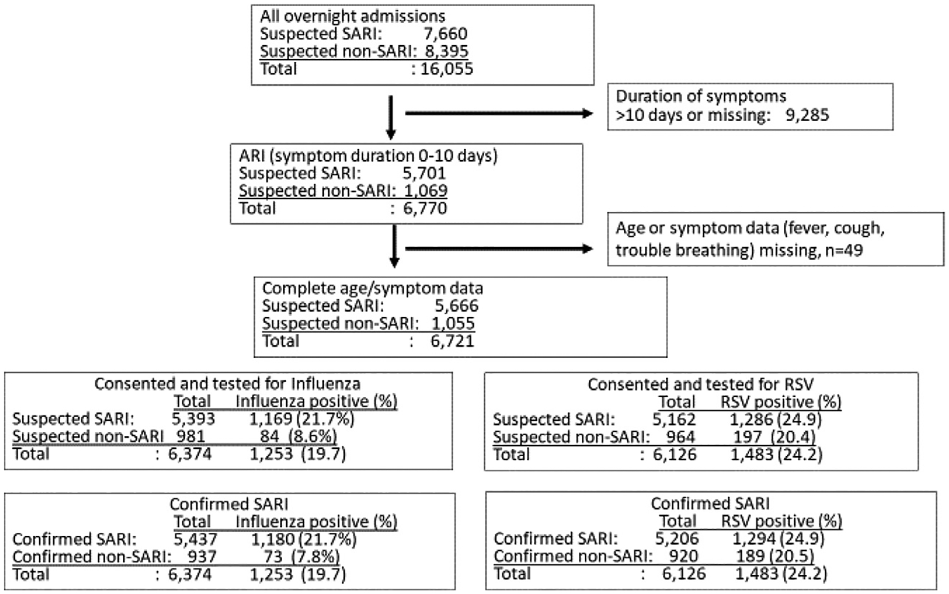 During April-September 2012–2016, SHIVERS identified 16,055 admissions with ARI; of 6374 cases consented and tested for influenza or RSV, 5437 (85%) had SARI and 937 (15%) did not. SARI had the highest specificity in detecting influenza (40.6%) and RSV (40.8%) but the lowest sensitivity (influenza 78.8%, RSV 60.3%) among patients of all ages. Cough or shortness of breath had the highest sensitivity (influenza 99.3%, RSV 99.9%) but the lowest specificity (influenza 1.6%, RSV 1.9%). SARI sensitivity among children aged <3 months was 60.8% for influenza and 43.6% for RSV–both lower than in other age groups.