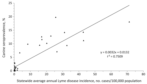 Description:To better define areas of human Lyme disease risk, we compared US surveillance data with published data on the seroprevalence of Borrelia burgdorferi antibodies among domestic dogs. Canine seroprevalence >5% was a sensitive but nonspecific marker of human risk, whereas seroprevalence <1% was associated with minimal risk for human infection.