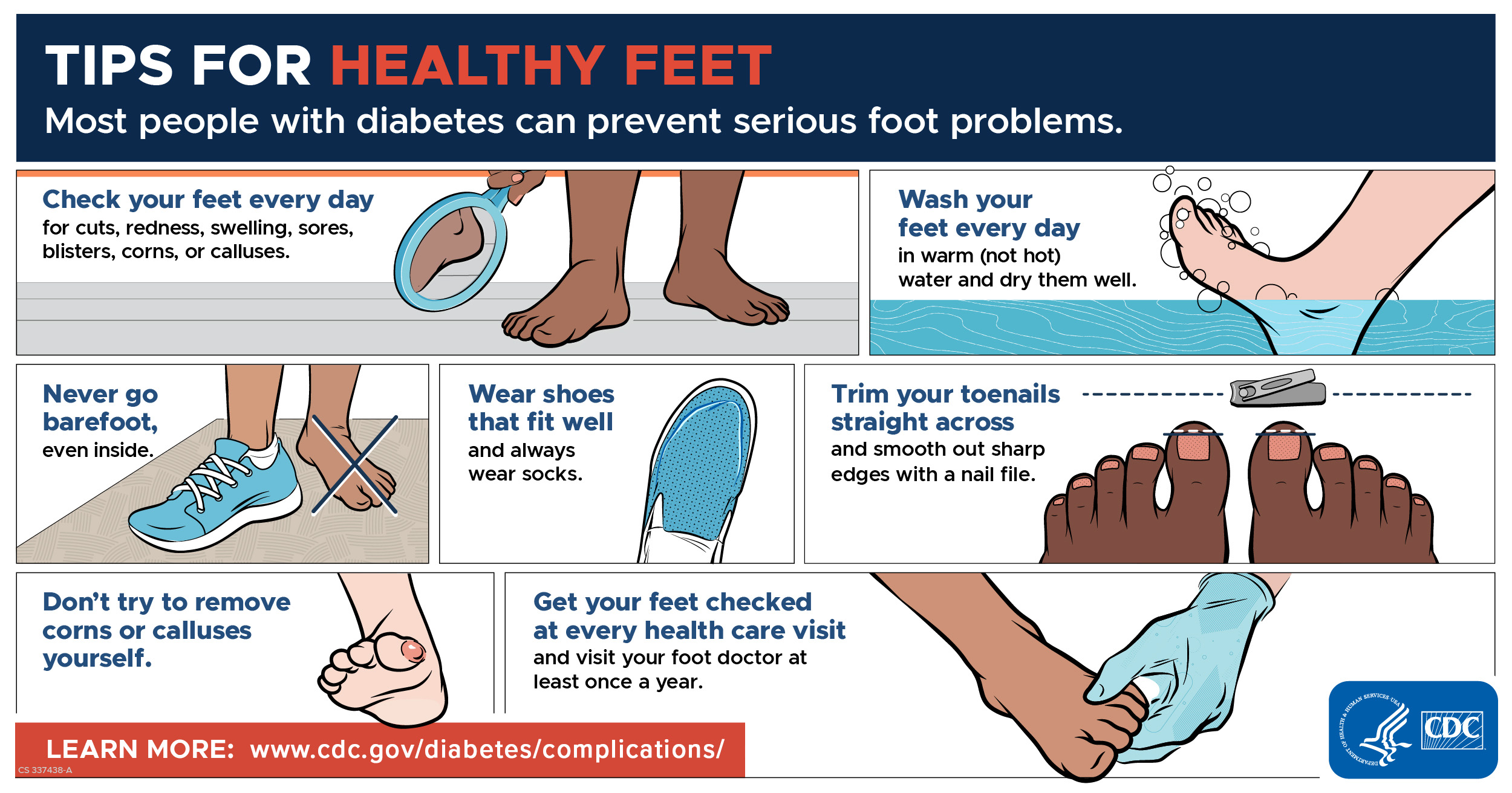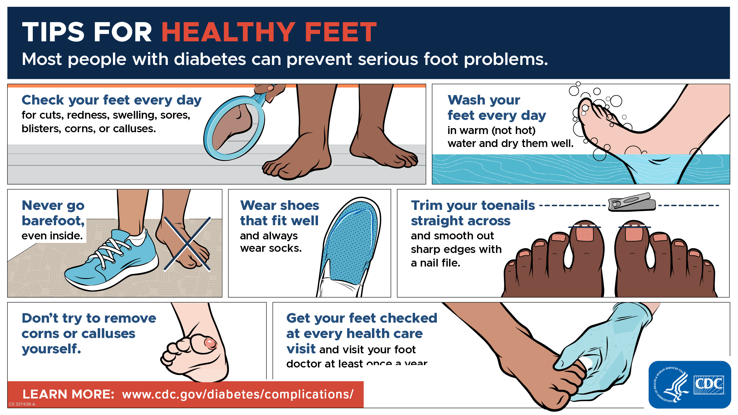 Description:Tips for Healthy Feet: Most people with diabetes can prevent serious foot problems. 1) Check your feet every day for cuts, redness, swelling, sores, blisters, corns, or calluses. 2) Wash your feet every day in warm (not hot) water and dry them well. 3) Never go barefoot, even inside. 4) Wear shoes that fit well and always wear socks. 5) Trim your toenails straight across and smooth out sharp edges with a nail file. 6) Don't try to remove corns or calluses yourself. 7) Get your feet checked at every health care visit and visit your foot doctor at least once a year.