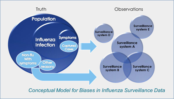 Infectious disease surveillance is a process the product of which reflects both actual disease trends and public awareness of the disease. Decisions made by patients, health care providers, and public health professionals about seeking and providing health care and about reporting cases to health authorities are all influenced by the information environment, which changes constantly. Biases are therefore imbedded in surveillance systems; these biases need to be characterized to provide better situational awareness for decision-making purposes. Our goal is to develop a statistical framework to characterize influenza surveillance systems, particularly their correlation with the information environment.