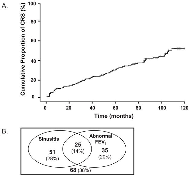 Firefighters exposed to World Trade Center (WTC) dust have developed chronic rhinosinusitis (CRS) and abnormal forced expiratory volume in 1 second (FEV1). Overlapping but distinct immune responses may be responsible for the clinical manifestations of upper and lower airway injury. We investigated whether a panel of inflammatory cytokines, either associated or not associated with WTC-LI, can predict future chronic rhinosinusitis disease and its severity.