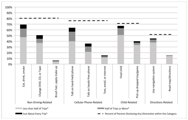 Nearly 90% of eligible parents participated. Analysis included 570 (92.2%) drivers. Non-driving and cellular phone-related distractions were disclosed by >75% of participants. Fewer participants disclosed child (71.2%) and directions-related distractions (51.9%). Child age was associated with each distraction category. Cellular phone-related distractions were associated with the child riding daily in the family car, non-Hispanic white and other race/ethnicity, and higher education. Parents admitting to drowsy driving and being pulled over for speeding had over two-times higher odds of disclosing distractions from each category.