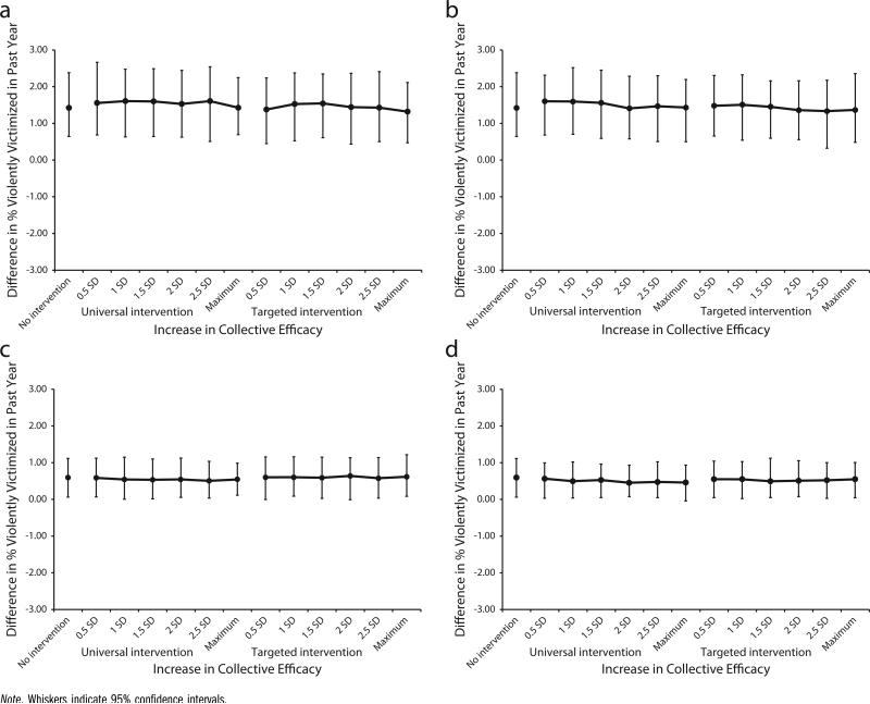 As a case study of the impact of universal versus targeted interventions on population health and health inequalities, we used simulations to examine (1) whether universal or targeted manipulations of collective efficacy better reduced population-level rates and racial/ethnic inequalities in violent victimization; and (2) whether experiments reduced disparities without addressing fundamental causes.