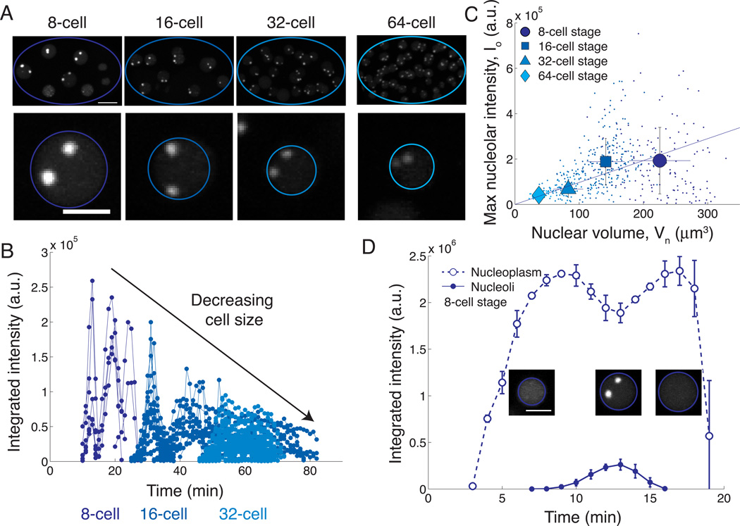 Description:Just as organ size typically increases with body size, the size of intracellular structures changes as cells grow and divide. Indeed, many organelles, such as the nucleus [1, 2], mitochondria [3], mitotic spindle [4, 5], and centrosome [6], exhibit size scaling, a phenomenon in which organelle size depends linearly on cell size. However, the mechanisms of organelle size scaling remain unclear. Here, we show that the size of the nucleolus, a membraneless organelle important for cell-size homeostasis [7], is coupled to cell size by an intracellular phase transition. We find that nucleolar size directly scales with cell size in early C. elegans embryos. Surprisingly, however, when embryo size is altered, we observe inverse scaling: nucleolar size increases in small cells and decreases in large cells. We demonstrate that this seemingly contradictory result arises from maternal loading of a fixed number rather than a fixed concentration of nucleolar components, which condense into nucleoli only above a threshold concentration. Our results suggest that the physics of phase transitions can dictate whether an organelle assembles, and, if so, its size, providing a mechanistic link between organelle assembly and cell size. Since the nucleolus is known to play a key role in cell growth, this biophysical readout of cell size could provide a novel feedback mechanism for growth control.