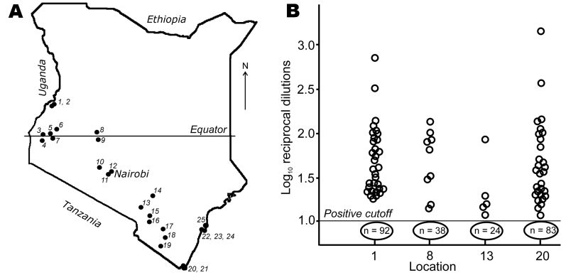 Description:The prevalence of neutralizing antibody against West Caucasian bat virus (WCBV) in Miniopterus bats collected in Kenya ranged from 17% to 26%. Seropositive bats were detected in 4 of 5 locations sampled across the country. These findings provide evidence that WCBV, originally isolated in Europe, may emerge in other continents.
