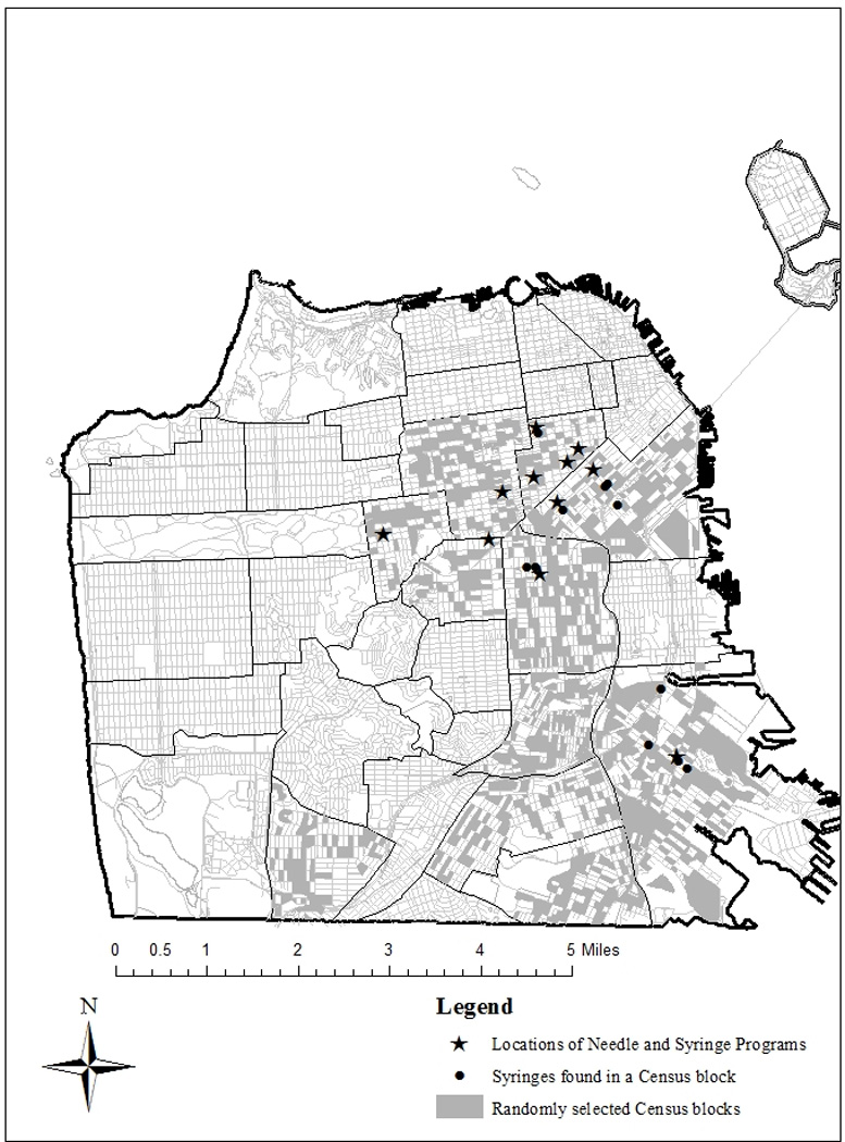 We conducted visual inspection walkthroughs in a random sample of the top-quartile of drug-affected neighborhoods in San Francisco, California (a city with NSPs) and Miami, Florida (a city without NSPs). We also conducted quantitative surveys of adult IDUs in San Francisco (N=602) and Miami (N=448).
