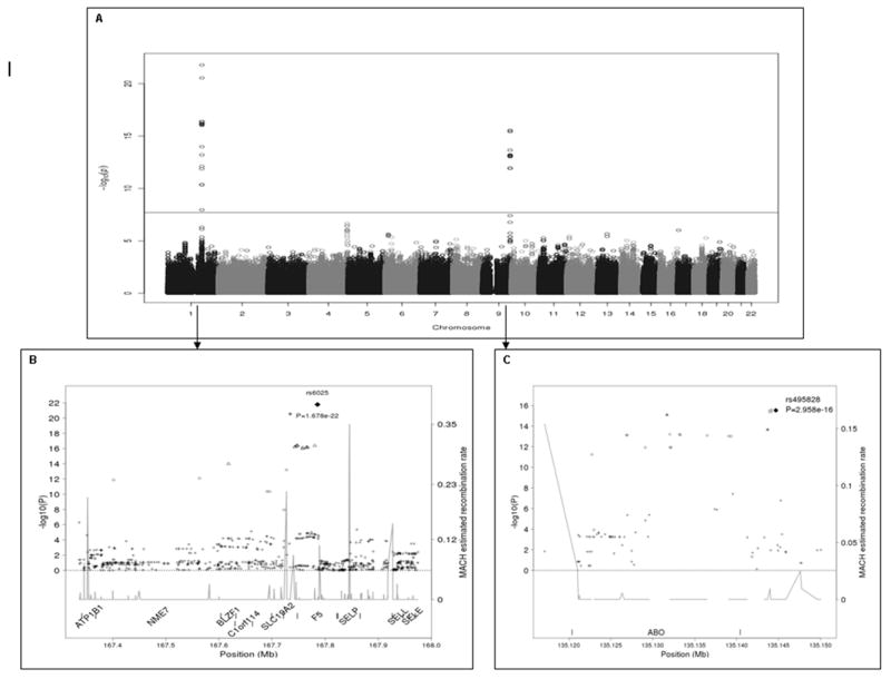 Seven SNPs exceeded genome-wide significance (P < 5 × 10-8); four on chromosome 1q24.2 (F5 rs6025 [Factor V Leiden], BLZF1 rs7538157, NME7 rs16861990 and SLC19A2 rs2038024) and three on chromosome 9q34.2 (ABO rs2519093 [ABO intron 1], rs495828, rs8176719 [ABO blood type O allele]). The replication study confirmed a significant association of F5, NME7, and ABO with VTE. However, F5 was the main signal on 1q24.2 as only ABO SNPs remained significantly associated with VTE after adjusting for F5 rs6025. This 1q24.2 region was shown to be inherited as a haplotype block. ABO resequencing identified 15 novel single nucleotide variations (SNV) in ABO intron 6 and the ABO 3’ UTR that were strongly associated with VTE (P < 10-4) and belonged to three distinct linkage disequilibrium (LD) blocks; none were in LD with ABO rs8176719 or rs2519093. Our sample size provided 80% power to detect odds ratios=2.0 and 1.51 for minor allele frequencies=0.05 and 0.5, respectively (α=1 × 10-8; 1% VTE prevalence).