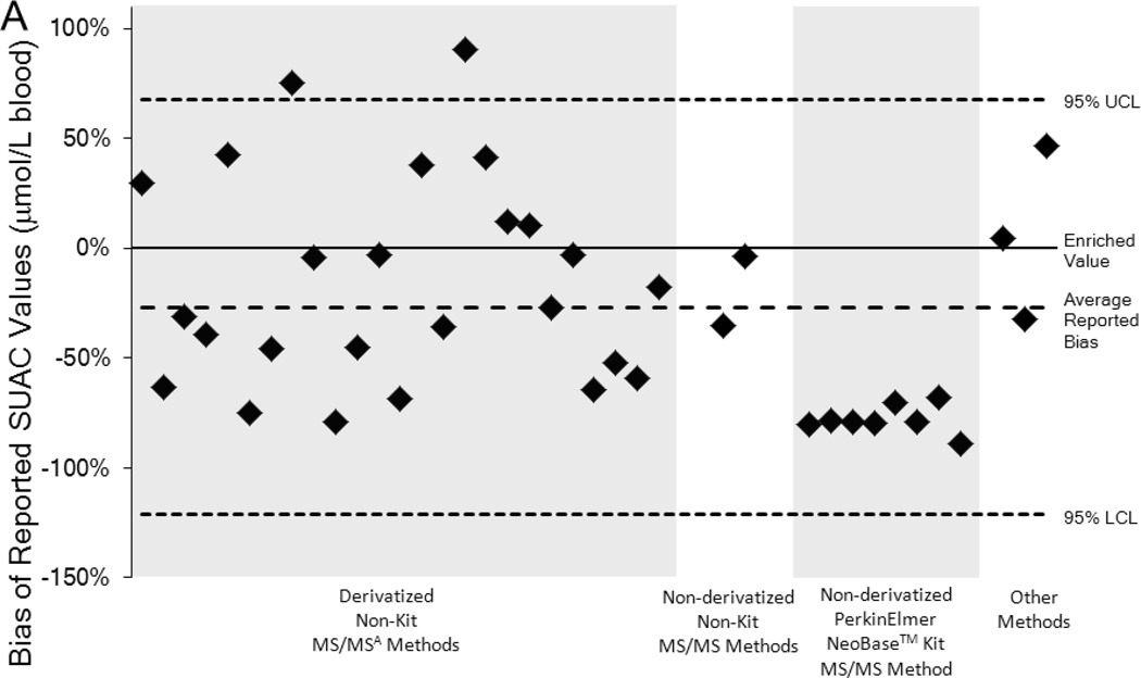 We used results reported for dried-blood-spot proficiency testing (PT) specimens and hepatorenal tyrosinemia patients’ newborn screening (NBS) samples to demonstrate analytic biases in SUAC recoveries and differences in presumptive clinical classifications.