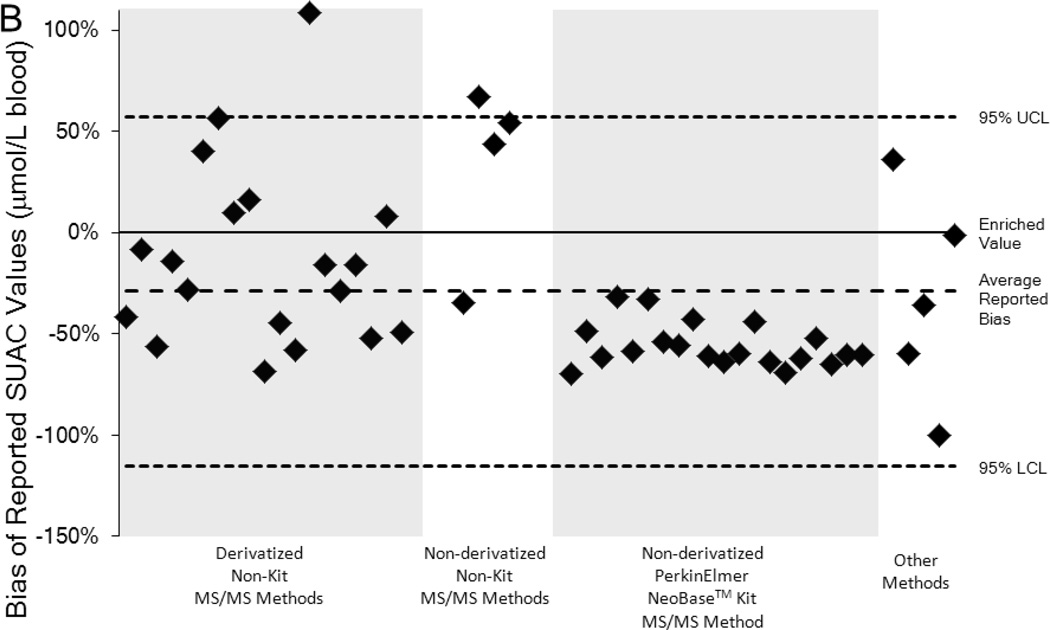 Analytic biases in SUAC recoveries were consistent from 2009–2011. Discordant clinical assessments of PT specimens were associated with high cutoff values for NeoBase™ kit results. Method-related differences in SUAC concentrations of tyrosinemia patients’ samples were consistent with those of PT specimens.