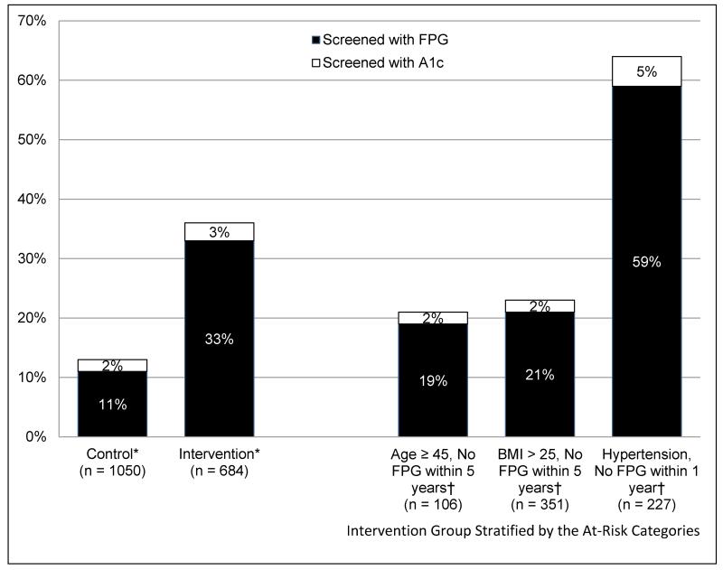 The proportion of at-risk members that completed a screening was higher in the intervention group than in the control group (36% vs. 13%, P < .001, adjusted for patient characteristics). Among those screened in the intervention group, the presence of obesity, hypertension, hyperlipidemia, and tobacco use were significant predictors of having a result which indicated diabetes or prediabetes (P < .05, all comparisons).