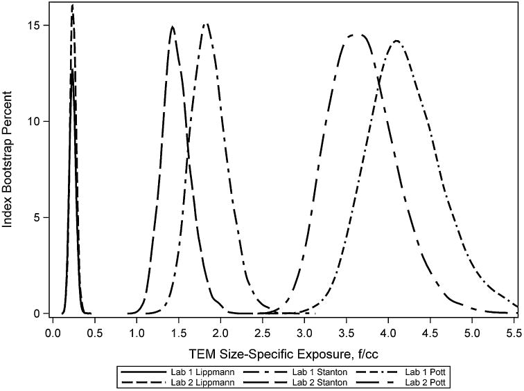 The International Standards Organization (ISO) transmission electron microscopy (TEM) method for asbestos was modified to increase the statistical precision of fiber size determinations, improve efficiency, and reduce analysis costs. Comparisons of the fiber size distributions and exposure indices by laboratory and counting method were performed.