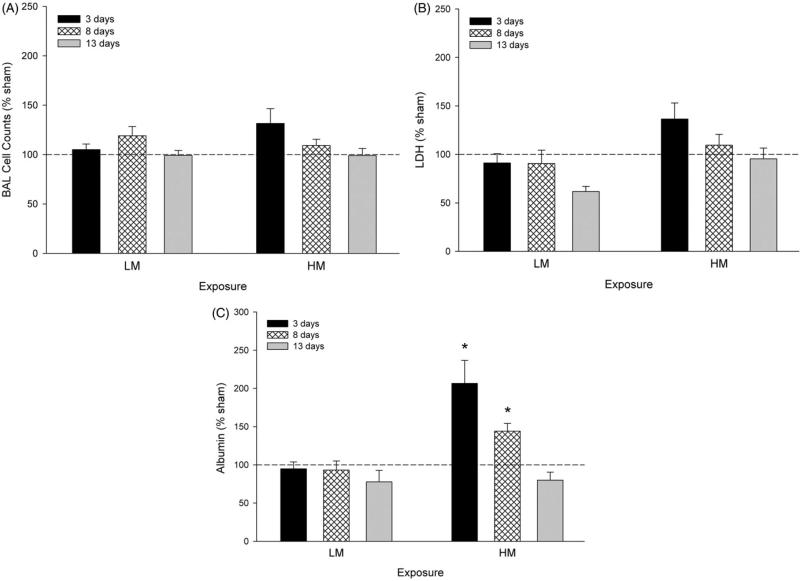 Description:Spot welding is used in the automotive and aircraft industries, where high-speed, repetitive welding is needed to join thin sections of metal. Epoxy adhesives are applied as sealers to the metal seams. Pulmonary function abnormalities and airway irritation have been reported in spot welders, but no animal toxicology studies exist. Therefore, the goal of this study was to investigate vascular, immune and lung toxicity measures after exposure to these metal fumes in an animal model. Male Sprague-Dawley rats were exposed by inhalation to 25 mg/m³ to either mild-steel spot welding aerosols with sparking (high metal, HM) or without sparking (low metal, LM) for 4 h/d for 3, 8 and 13 d. Shams were exposed to filtered air. Bronchoalveolar lavage (BAL), lung gene expression and ex vivo BAL cell challenge were performed to assess lung toxicity. Lung resistance (R(L)) was evaluated before and after challenge with inhaled methacholine (MCh). Functional assessment of the vascular endothelium in isolated rat tail arteries and leukocyte differentiation in the spleen and lymph nodes via flow cytometry was also done. Immediately after exposure, baseline R(L) was significantly elevated in the LM spot welding aerosols, but returned to control level by 24 h postexposure. Airway reactivity to MCh was unaffected. Lung inflammation and cytotoxicity were mild and transient. Lung epithelial permeability was significantly increased after 3 and 8 d, but not after 13 d of exposure to the HM aerosol. HM aerosols also caused vascular endothelial dysfunction and increased CD4+, CD8+ and B cells in the spleen. Only LM aerosols caused increased IL-6 and MCP-1 levels compared with sham after ex vivo LPS stimulation in BAL macrophages. Acute inhalation of mild-steel spot welding fumes at occupationally relevant concentrations may act as an irritant as evidenced by the increased R(L) and result in endothelial dysfunction, but otherwise had minor effects on the lung.