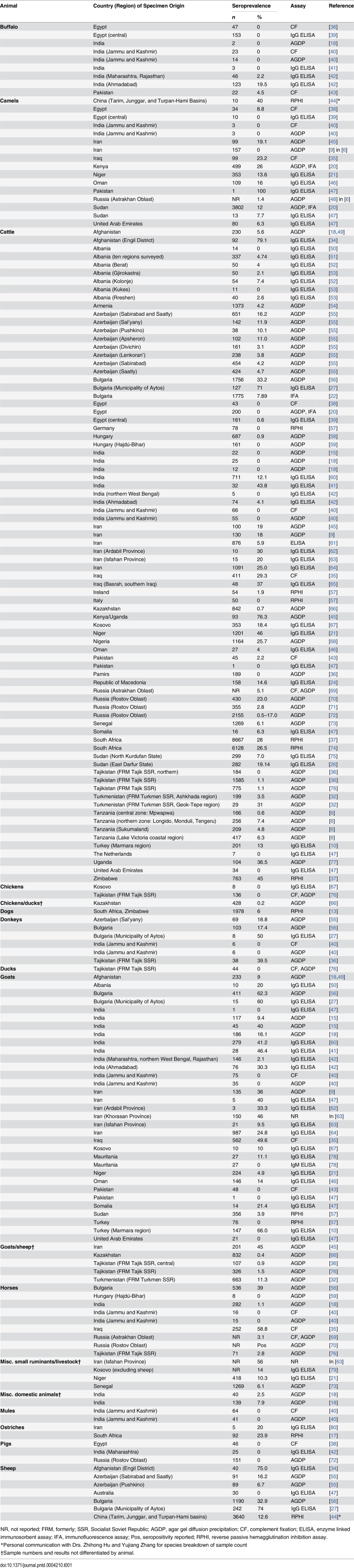 Description:Crimean-Congo hemorrhagic fever (CCHF) is a widely distributed, tick-borne viral disease. Humans are the only species known to develop illness after CCHF virus (CCHFV) infection, characterized by a nonspecific febrile illness that can progress to severe, often fatal, hemorrhagic disease. A variety of animals may serve as asymptomatic reservoirs of CCHFV in an endemic cycle of transmission. Seroepidemiological studies have been instrumental in elucidating CCHFV reservoirs and in determining endemic foci of viral transmission. Herein, we review over 50 years of CCHFV seroepidemiological studies in domestic and wild animals. This review highlights the role of livestock in the maintenance and transmission of CCHFV, and provides a detailed summary of seroepidemiological studies of wild animal species, reflecting their relative roles in CCHFV ecology.