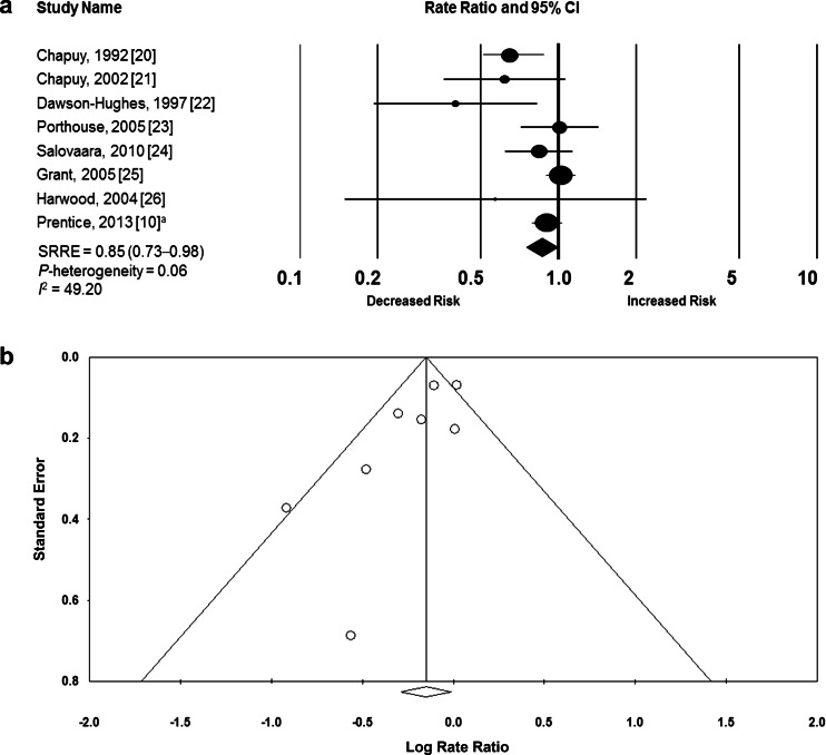 Of the citations retrieved, eight studies including 30,970 participants met criteria for inclusion in the primary analysis, reporting 195 hip fractures and 2231 total fractures. Meta-analysis of all studies showed that calcium plus vitamin D supplementation produced a statistically significant 15 % reduced risk of total fractures (SRRE, 0.85; 95 % confidence interval [CI], 0.73–0.98) and a 30 % reduced risk of hip fractures (SRRE, 0.70; 95 % CI, 0.56–0.87). Numerous sensitivity and subgroup analyses produced similar summary associations. A limitation is that this study utilized data from subgroup analysis of the Women’s Health Initiative.