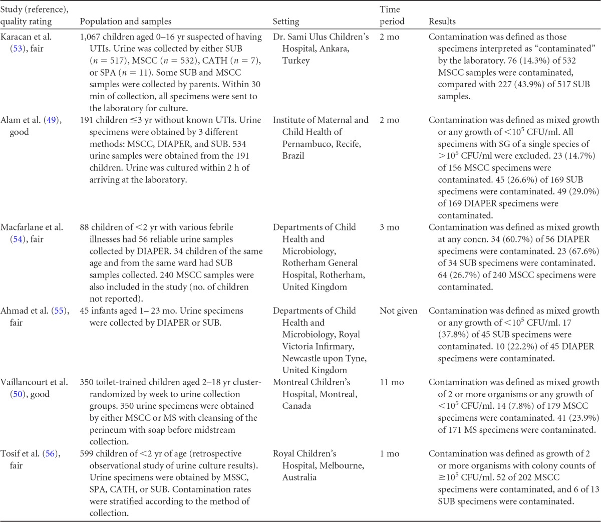 Both boric acid and refrigeration adequately preserved urine specimens prior to their processing for up to 24 h. Urine held at room temperature for more than 4 h showed overgrowth of both clinically significant and contaminating microorganisms. The overall strength of this body of evidence, however, was rated as low. For urine specimens collected from women, there was no difference in rates of contamination for midstream urine specimens collected with or without cleansing. The overall strength of this evidence was rated as high. The levels of diagnostic accuracy of midstream urine collection with or without cleansing were similar, although the overall strength of this evidence was rated as low. For urine specimens collected from men, there was a reduction in contamination in favor of midstream clean-catch over first-void specimen collection. The strength of this evidence was rated as high. Only one study compared midstream collection with cleansing to midstream collection without cleansing. Results showed no difference in contamination between the two methods of collection. However, imprecision was due largely to the small event size. The diagnostic accuracy of midstream urine collection from men compared to straight catheterization or suprapubic aspiration was high. However, the overall strength of this body of evidence was rated as low. For urine specimens collected from children and infants, the evidence comparing contamination rates for midstream urine collection with cleansing, midstream collection without cleansing, sterile urine bag collection, and diaper collection pointed to larger reductions in the odds of contamination in favor of midstream collection with cleansing over the other methods of collection. This body of evidence was rated as high. The accuracy of diagnosis of urinary tract infection from midstream clean-catch urine specimens, sterile urine bag specimens, or diaper specimens compared to straight catheterization or suprapubic aspiration was varied.