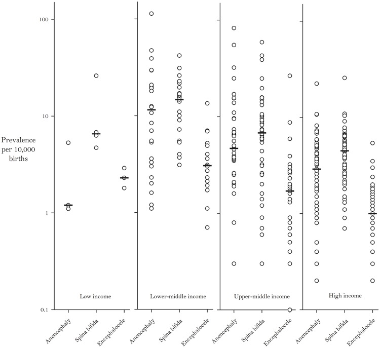 We conducted a systematic review and searched multiple databases for NTD prevalence estimates and abstracted data from peer-reviewed literature, birth defects surveillance registries, and reports published between January 1990 and July 2014 that had greater than 5,000 births and were not solely based on mortality data. We classified countries according to World Health Organization (WHO) regions and World Bank income classifications. The initial search yielded 11,614 results; after systematic review we identified 160 full text manuscripts and reports that met the inclusion criteria. Data came from 75 countries. Coverage by WHO region varied in completeness (i.e., % of countries reporting) as follows: African (17%), Eastern Mediterranean (57%), European (49%), Americas (43%), South-East Asian (36%), and Western Pacific (33%). The reported NTD prevalence ranges and medians for each region were: African (5.2–75.4; 11.7 per 10,000 births), Eastern Mediterranean (2.1–124.1; 21.9 per 10,000 births), European (1.3–35.9; 9.0 per 10,000 births), Americas (3.3–27.9; 11.5 per 10,000 births), South-East Asian (1.9–66.2; 15.8 per 10,000 births), and Western Pacific (0.3–199.4; 6.9 per 10,000 births). The presence of a registry or surveillance system for NTDs increased with country income level: low income (0%), lower-middle income (25%), upper-middle income (70%), and high income (91%).