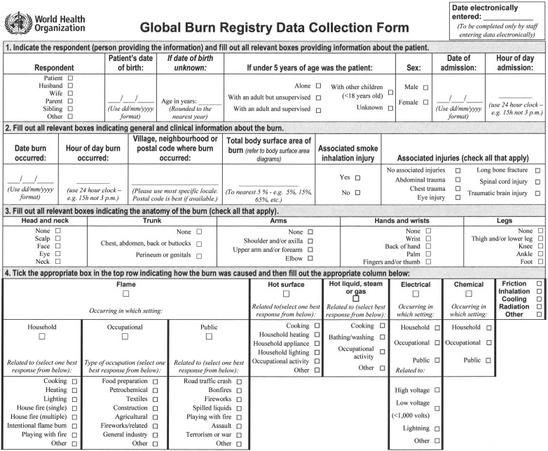 Limited and fragmented data collection systems exist for burn injury. A global registry may lead to better injury estimates and identify risk factors. A collaborative effort involving the WHO, the Global Alliance for Clean Cookstoves, the CDC and the International Society for Burn Injuries was undertaken to simplify and standardise inpatient burn data collection. An expert panel of epidemiologists and burn care practitioners advised on the development of a new Global Burn Registry (GBR) form and online data entry system that can be expected to be used in resource-abundant or resource-limited settings.