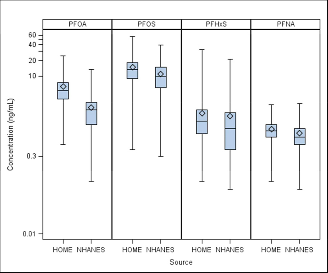 Data are from a prospective cohort in Cincinnati, OH (HOME Study). We measured perfluorooctanoic (PFOA), perfluorooctane sulfonic (PFOS), perfluorononanoic (PFNA), and perfluorohexane sulfonic (PFHxS) acids in prenatal serum samples. We estimated differences in body mass index z-scores (BMI), waist circumference, and body fat at 8 years of age (n=204) and BMI between 2–8 years of age (n=285) according to PFAS concentrations.