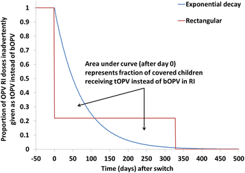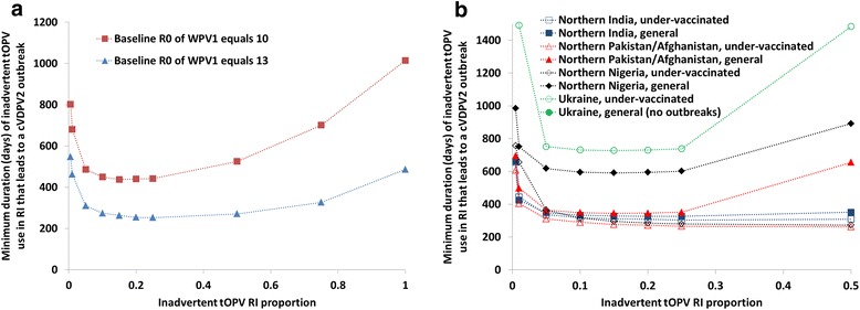 At low levels of inadvertent tOPV use, the minimum time after the switch for the inadvertent use to cause a cVDPV2 outbreak decreases sharply with increasing proportions of children inadvertently receiving tOPV. The minimum times until inadvertent tOPV use in an SIA or in RI can lead to a cVDPV2 outbreak varies widely among populations, with higher basic reproduction numbers, lower tOPV-induced population immunity to serotype 2 poliovirus transmission prior to the switch, and a lower proportion of transmission occurring via the oropharyngeal route all resulting in shorter times. In populations with the lowest expected immunity to serotype 2 poliovirus transmission after the switch, inadvertent tOPV use in an SIA leads to a cVDPV2 outbreak if it occurs as soon as 9 months after the switch with 0.5 % of children aged 0–4 years inadvertently receiving tOPV, and as short as 6 months after the switch with 10–20 % of children aged 0–1 years inadvertently receiving tOPV. In the same populations, inadvertent tOPV use in RI leads to a cVDPV2 outbreak if 0.5 % of OPV RI doses given use tOPV instead of bOPV for at least 20 months after the switch, with the minimum length of use dropping to at least 9 months if inadvertent tOPV use occurs in 50 % of OPV RI doses.