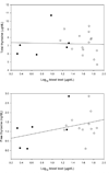 Group means from studies of the thyroid function of persons occupationally exposed to lead were used in a meta-analysis. Differences between the control and exposed groups, and the slopes between thyroid hormone concentrations and log10 blood lead concentrations or duration of exposure to lead were estimated using mixed models. The hormones analyzed were thyroid stimulating hormone, total and free thyroxine, and total and free triiodothyronine.