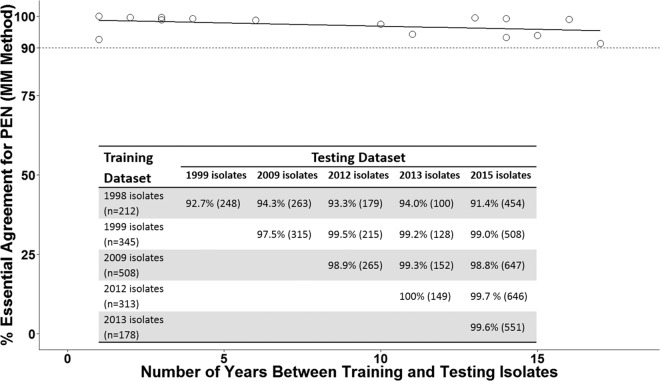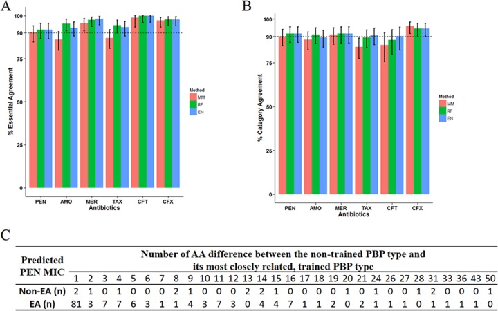 Description:β-Lactam antibiotics are the drugs of choice to treat pneumococcal infections. The spread of β-lactam-resistant pneumococci is a major concern in choosing an effective therapy for patients. Systematically tracking β-lactam resistance could benefit disease surveillance. Here we developed a classification system in which a pneumococcal isolate is assigned to a "PBP type" based on sequence signatures in the transpeptidase domains (TPDs) of the three critical penicillin-binding proteins (PBPs), PBP1a, PBP2b, and PBP2x. We identified 307 unique PBP types from 2,528 invasive pneumococcal isolates, which had known MICs to six β-lactams based on broth microdilution. We found that increased β-lactam MICs strongly correlated with PBP types containing divergent TPD sequences. The PBP type explained 94 to 99% of variation in MICs both before and after accounting for genomic backgrounds defined by multilocus sequence typing, indicating that genomic backgrounds made little independent contribution to β-lactam MICs at the population level. We further developed and evaluated predictive models of MICs based on PBP type. Compared to microdilution MICs, MICs predicted by PBP type showed essential agreement (MICs agree within 1 dilution) of >98%, category agreement (interpretive results agree) of >94%, a major discrepancy (sensitive isolate predicted as resistant) rate of <3%, and a very major discrepancy (resistant isolate predicted as sensitive) rate of <2% for all six β-lactams. Thus, the PBP transpeptidase signatures are robust indicators of MICs to different β-lactam antibiotics in clinical pneumococcal isolates and serve as an accurate alternative to phenotypic susceptibility testing.|The human pathogen Streptococcus pneumoniae is a leading cause of morbidity and mortality worldwide. β-Lactam antibiotics such as penicillin and ceftriaxone are the drugs of choice to treat pneumococcal infections. Some pneumococcal strains have developed β-lactam resistance through altering their penicillin-binding proteins (PBPs) and have become a major concern in choosing effective patient therapy. To systematically track and predict β-lactam resistance, we obtained the sequence signatures of PBPs from a large collection of clinical pneumococcal isolates using whole-genome sequencing data and found that these "PBP types" were predictive of resistance levels. Our findings can benefit the current era of strain surveillance when whole-genome sequencing data often lacks detailed resistance information. Using PBP positions that we found are always substituted within highly resistant strains may lead to further refinements. Sequence-based predictions are accurate and may lead to the ability to extract critical resistance information from nonculturable clinical specimens.