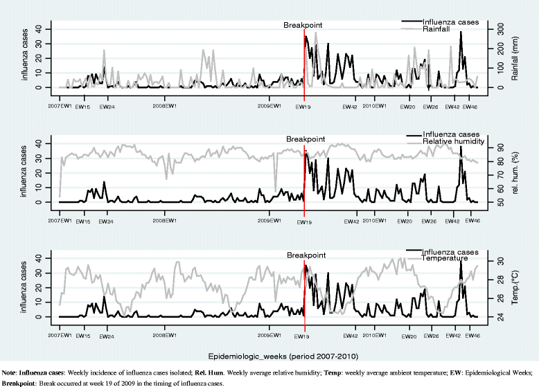 In temperate regions, influenza epidemics occur in the winter and correlate with certain climatological parameters. In African tropical regions, the effects of climatological parameters on influenza epidemics are not well defined. This study aims to identify and model the effects of climatological parameters on seasonal influenza activity in Abidjan, Cote d’Ivoire.