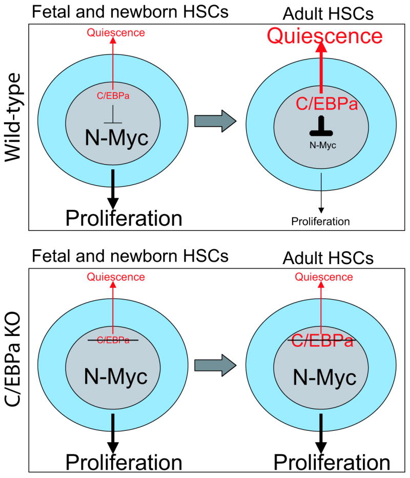 Description:In blood, the transcription factor C/EBPa is essential for myeloid differentiation and has been implicated in regulating self-renewal of fetal liver haematopoietic stem cells (HSCs). However, its function in adult HSCs has remained unknown. Here, using an inducible knockout model we found that C/EBPa-deficient adult HSCs underwent a pronounced increase in number with enhanced proliferation, characteristics resembling fetal liver HSCs. Consistently, transcription profiling of C/EBPa-deficient HSCs revealed a gene expression program similar to fetal liver HSCs. Moreover, we observed that age-specific Cebpa expression correlated with its inhibitory effect on the HSC cell cycle. Mechanistically we identified N-Myc as a downstream target of C/EBPa, and loss of C/EBPa resulted in de-repression of N-Myc. Our data establish C/EBPa as a central determinant in the switch from fetal to adult HSCs.