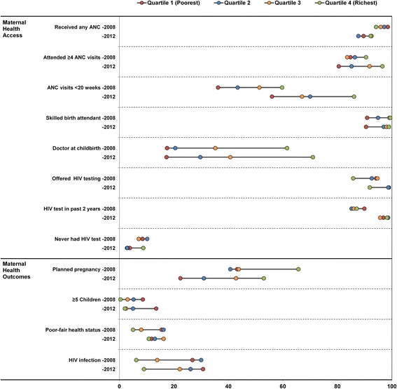 Data were analysed from serial population-level household surveys that applied multistage-stratified sampling. Access to maternal health services and health outcomes in 2008 (n = 1121) were compared with those in 2012 (n = 1648). Differences between socio-economic quartiles were quantified using the relative (RII) and slope (SII) index of inequality, based on survey weights.