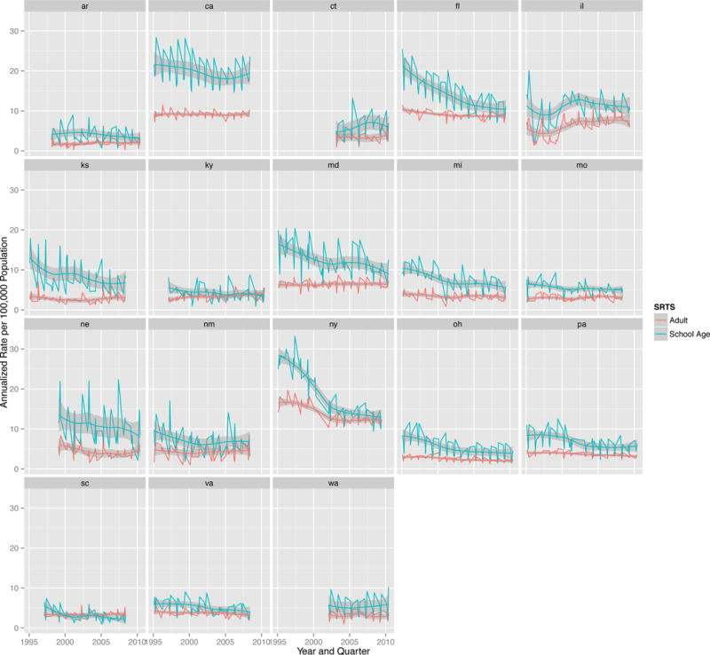 Description:Safe Routes to School (SRTS) was a federally funded transportation program for facilitating physically active commuting to and from school in children through improvements of the built environment. There is evidence that SRTS programs increase walking and bicycling in school-age children, but their impact on pedestrian and bicyclist safety has not been adequately examined. We investigate the impact and effects of the SRTS program on school-age pedestrian and bicyclist injuries in a nationwide sample in the United States.|Data were crash records for school-age children (5-19 years) and adults (30-64 years), in 18 U.S. states for a 16-year period (1995-2010). Multilevel negative binomial models were used to examine the association between SRTS intervention and the risk of pedestrian and bicyclist injury in children aged 5-19 years.|SRTS was associated with an approximately 23% reduction (incidence rate ratio = 0.77, 95% confidence interval = 0.65-0.92) in pedestrian/bicyclist injury risk and a 20% reduction in pedestrian/bicyclist fatality risk (incidence rate ratio = 0.80, 95% confidence interval = 0.68-0.94) in school-age children compared to adults aged 30-64 years.|Implementation of the SRTS program appears to have contributed to improving traffic safety for school-age children in the United States.