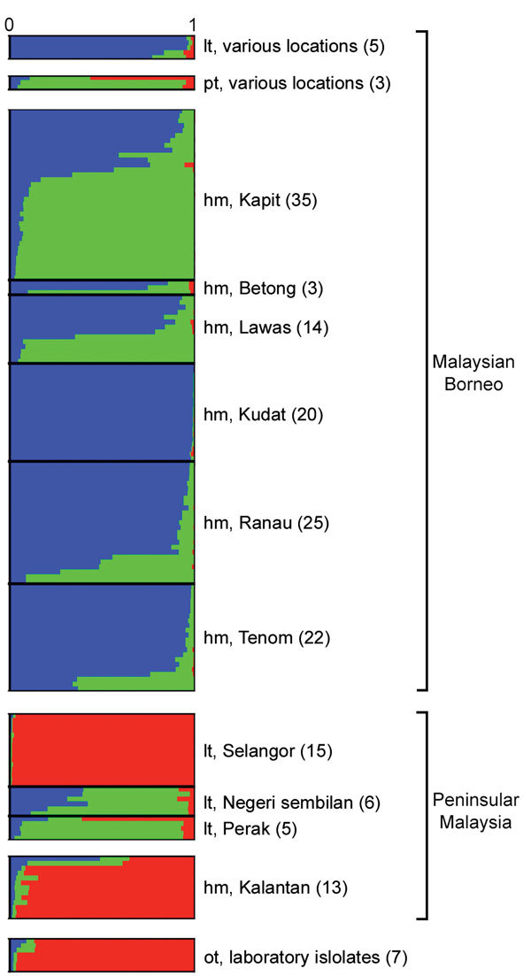 Description:Multilocus microsatellite genotyping of Plasmodium knowlesi isolates previously indicated 2 divergent parasite subpopulations in humans on the island of Borneo, each associated with a different macaque reservoir host species. Geographic divergence was also apparent, and independent sequence data have indicated particularly deep divergence between parasites from mainland Southeast Asia and Borneo. To resolve the overall population structure, multilocus microsatellite genotyping was conducted on a new sample of 182 P. knowlesi infections (obtained from 134 humans and 48 wild macaques) from diverse areas of Malaysia, first analyzed separately and then in combination with previous data. All analyses confirmed 2 divergent clusters of human cases in Malaysian Borneo, associated with long-tailed macaques and pig-tailed macaques, and a third cluster in humans and most macaques in peninsular Malaysia. High levels of pairwise divergence between each of these sympatric and allopatric subpopulations have implications for the epidemiology and control of this zoonotic species.