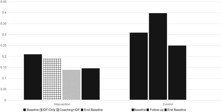 Risky driving behaviors declined significantly more during the period with coaching plus instant feedback with lights in comparison to the period with lights-only feedback (ORadj = 0.61 95% CI 0.43–0.86; Holm-adjusted p = 0.035) and the control group (ORadj = 0.52 95% CI 0.33–0.82; Holm-adjusted p = 0.032). Lights-only feedback was not found to be significantly different than the control group's decline from baseline (ORadj = 0.86 95% CI 0.51–1.43; Holm-adjusted p > 0.05).