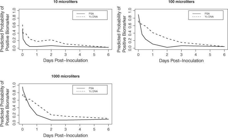 Immediately after exposure to 1000 μL of semen, the predicted sensitivity of being PSA positive was 0.96; this decreased to 0.65, 0.44, 0.21 and 0.07 at 6, 12, 24 and 48 h, respectively. Corresponding predicted sensitivity of being Yc DNA positive was 0.72 immediately postexposure; this increased to 0.76 at 1 h postexposure and then decreased to 0.60 (at 6 h), 0.63 (at 12 h), 0.49 (at 24 h), 0.21 (at 48 h), 0.17 (at 72 h) and 0.12 (at 144 h).