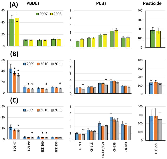Description:We report longitudinal serum concentrations of select persistent organic pollutants (POPs) in children at ages 7 and 9 years and in their mothers prenatally and again when the children were 9 years old. The participating families were enrolled in the Center for the Health Assessment of Mothers and Children of Salinas (CHAMACOS), a longitudinal birth cohort study of low-income Hispanic families residing in the Salinas Valley, California. We observed decreasing concentrations in the mothers with year of serum collection (2009 vs 2011) for six out of seven polybrominated diphenyl ether (PBDE) congeners and for 2,2',4,4',5-pentachlorobiphenyl (CB-99; p < 0.05). The 9-year-old children had similarly decreasing serum concentrations of all seven PBDE congeners, CB-99, and 2,2',3,4,4',5'- and 2,3,3',4,4',6-hexachlorobiphenyl (CB-138/158) with year of serum collection (2009 vs 2011; p < 0.05). In mixed effect models accounting for weight gain as the children aged from 7 to 9 years, we observed an annual decrease (-8.3% to -13.4%) in tri- to hexaBDE concentrations (p < 0.001), except for 2,2',3,4,4'-tetrabromodiphenyl ether (BDE-85) and 2,2',4,4',5,5'-hexabromodiphenyl ether (BDE-153). The concentrations of these congeners were not associated with time of serum collection and instead showed an -0.9% to -2.6% decrease per kilogram of weight gain during the study period (p < 0.05). In the case of tetra- to heptachlorobiphenyls, we observed -0.5% to -0.7% decrease in serum concentration per kilogram of weight gain (p < 0.05) and -3.0% to -3.7% decrease in serum concentration per year of aging (p < 0.05), except for 2,3',4,4',5-pentachlorobiphenyl (CB-118) and 2,2',4,4',5,5'-hexachlorobiphenyl (CB-153), which were not associated with time of serum draw. 2,2-Bis(4-chlorophenyl)-1,1-dichloroethene (p,p'-DDE) decreased -2.4%/kg of weight gain between the two sampling points (p < 0.001). These findings suggest that as children grow, dilution in a larger body size plays an important role in explaining reductions in body burden in the case of traditional POPs such as PCBs and p,p'-DDE. By contrast, in the case of PBDEs, reductions are likely explained by reduction in exposure, as illustrated by decreased concentrations in more recent years, possibly amplified by presumed shorter biological half-life than other POPs.