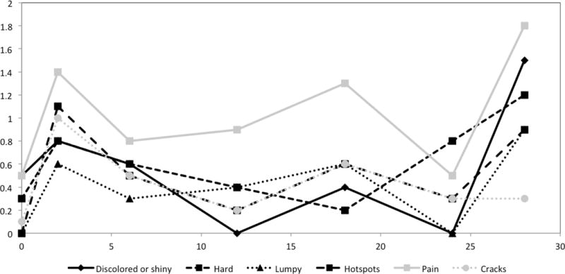 Through 28-weeks post-partum, 88 of 1472 women experienced at least one occurrence of mastitis or breast inflammation. The 28-week risk was higher for maternal ART (RD 4.5, 95% confidence interval (CI): 0.9, 8.1) and infant NVP (RD: 3.6, 95%CI: 0.9-6.9) compared to standard of care. The hazard of late-appearing mastitis or breast inflammation (from week 5-28) was also higher for maternal ART (HR: 6.7, 95%CI: 2.0, 22.6) and infant NVP (HR: 5.1, 95%CI: 1.5, 17. 5) compared to the standard of care.
