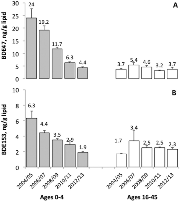 Description:In Australia, systematic biomonitoring of persistent organic pollutants (POPs) in pooled serum samples stratified by age and sex has occurred every two years between 2002/03 and 2012/13. Multiple regression modeling on log10-transformed serum pool concentrations of BDEs 47, 99, 100 and 153 and on the sum of these (Σ|PBDE) was conducted to examine trends by sex and time since baseline, stratified by age group. Temporal trends were age- and congener-specific, with the largest changes per year of observation in the 0-4 year old group, with β (SE) = -0.098 (0.013) for log|BDE47; -0.119 (0.012) for log|BDE99; -0.084 (0.014) for log|BDE100, and -0.053 (0.013) for log|BDE153, all p < 0.001. Adults over age 16 showed much smaller decreasing temporal trends for BDE47 and BDE99, no significant changes in BDE100, and, for the oldest age groups, slight increases in BDE153. As a result, Σ|PBDE concentrations were stable over the entire time period in adults older than 16. Concentrations of each BDE in pools from females aged 31-60 were significantly lower compared to males. Relative proportions of BDE47 declined, while BDE153 accounted for a greater share of Σ|PBDE over time. Whereas previously we saw a large elevation in the youngest age groups compared to older children and adults, this is no longer the case. This may be due to a decline in infant and toddler exposures in the indoor environment as use of PBDEs in consumer products has been phased out, suggesting temporal changes in the relative sources of exposure for young children in Australia.