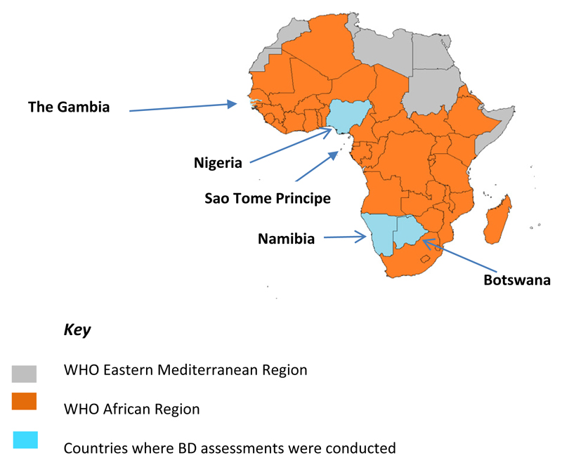 Between August 2015 and November 2016, a series of knowledge, attitude and practices assessments were conducted in a convenience sample of public and private health facilities in Botswana, the Gambia, Namibia, Nigeria, and São Tomé and Príncipe (STP). Data were collected from immunization and maternity staff through interviewer-administered questionnaires focusing on HepB-BD vaccination knowledge, practices and barriers, including those related to home births. HepB-BD coverage was calculated for each visited facility.