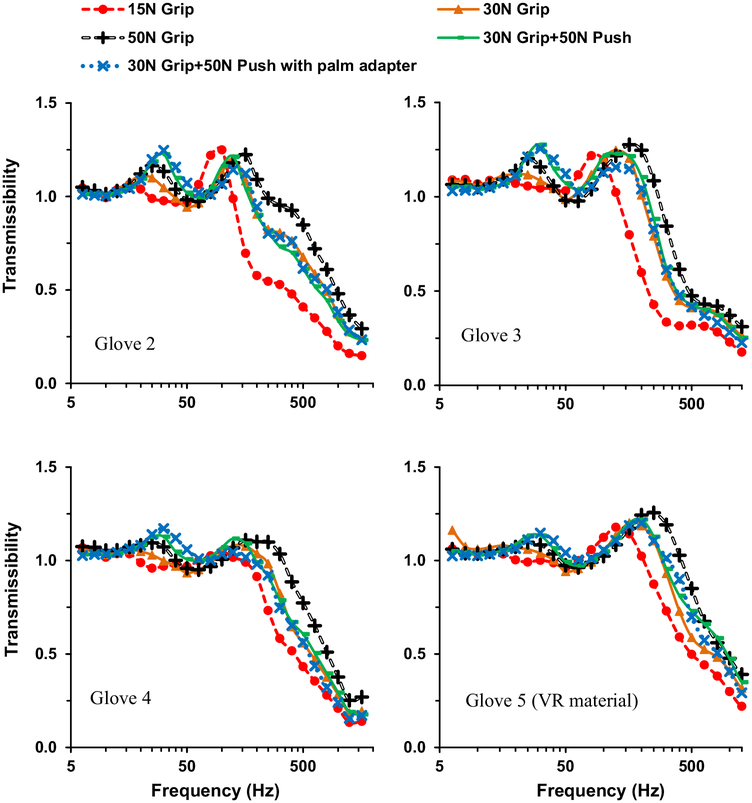 Description:The objective of this study was to develop a convenient and reliable adapter method for testing and evaluating vibration-reducing (VR) gloves and VR materials at the fingers. The general requirements and technical specifications for the design of the new adapter were based on our previous studies of hand-held adapters for vibration measurement and a conceptual model of the fingers-adapter-glove-handle system developed in this study. Two thicknesses (2 mm and 3 mm) of the adapter beam were fabricated using a 3-D printer. Each adapter is a thin beam equipped with a miniature tri-axial accelerometer (1.1 g) mounted at its center, with a total weight ≤ 2.2 g. To measure glove vibration transmissibility, the adapter is held with two gloved fingers; a finger is positioned on each side of the accelerometer. Each end of the adapter beam is slotted between the glove material and the finger. A series of experiments was conducted to evaluate this two-fingers-held adapter method by measuring the transmissibility of typical VR gloves and a sample VR material. The experimental results indicate that the major resonant frequency of the lightweight adapter on the VR material (≥800 Hz) is much higher than the resonant frequencies of the gloved fingers grasping a cylindrical handle (≤300 Hz). The experimental results were repeatable across the test treatments. The basic characteristics of the measured glove vibration transmissibility are consistent with the theoretical predictions based on the biodynamics of the gloved fingers-hand-arm system. The results suggest that VR glove fingers can effectively reduce only high-frequency vibration, and VR effectiveness can be increased by reducing the finger contact force. This study also demonstrated that the finger adapter method can be combined with the palm adapter method prescribed in the standardized glove test, which can double the test efficiency without substantially increasing the expense of the test.