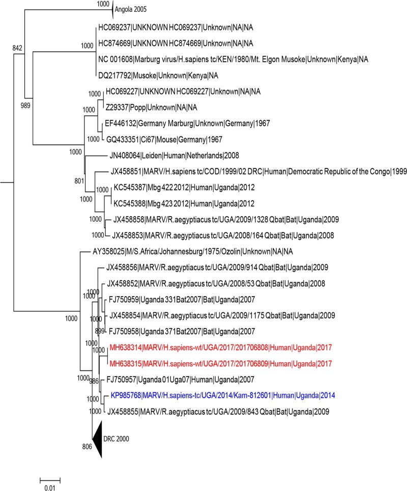 Seventy individuals (34 MVD suspected cases and 36 close contacts of confirmed cases) were epidemiologically investigated, with blood samples tested for MVD. Only four cases met the MVD case definition; one was categorized as a probable case while the other three were confirmed cases. A total of 299 contacts were identified; during follow- up, two were confirmed as MVD. Of the four confirmed and probable MVD cases, three died, yielding a case fatality rate of 75%. All four cases belonged to a single family and 50% (2/4) of the MVD cases were female. All confirmed cases had clinical symptoms of fever, vomiting, abdominal pain and bleeding from body orifices. Viral sequences indicated that the Marburg virus strain responsible for this outbreak was closely related to virus strains previously shown to be circulating in Uganda.