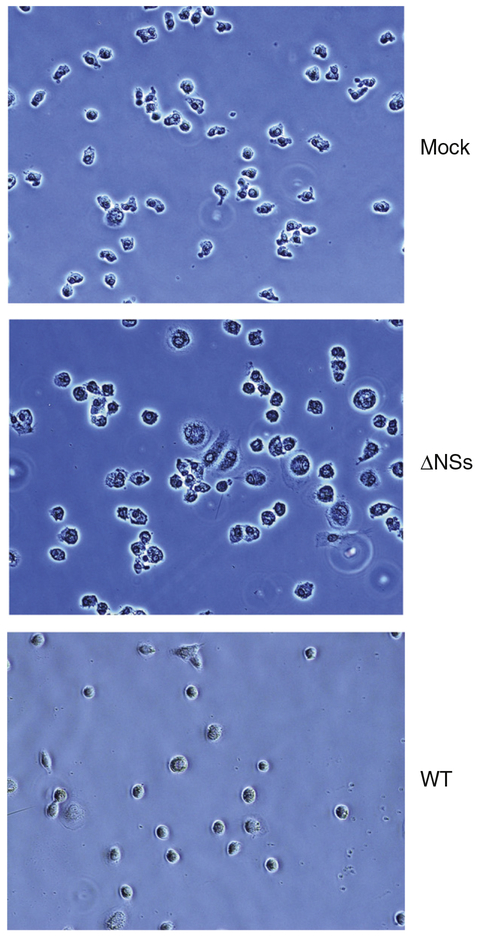 Description:Rift Valley fever virus (RVFV) causes significant morbidity and mortality in humans and livestock throughout Africa and the Middle East. The clinical disease ranges from mild febrile illness, to hepatitis, retinitis, encephalitis and fatal hemorrhagic fever. RVFV NSs protein has previously been shown to interfere in vitro with the interferon response, and RVFV lacking the NSs protein is attenuated in several animal models. Monocytes and macrophages are key players in the innate immune response via expression of various cytokines and chemokines. Here we demonstrate that wild-type RVFV infection of human monocyte-derived macrophages leads to a productive infection and inhibition of the innate immune response via decreased expression of IFN-α2, IFN-β and TNF-α. Using a recombinant virus lacking the NSs protein, we show that this effect is mediated by the viral NSs protein. Finally, analysis of RVF patient samples demonstrated an association between a pro-inflammatory cytokine response and patient survival.