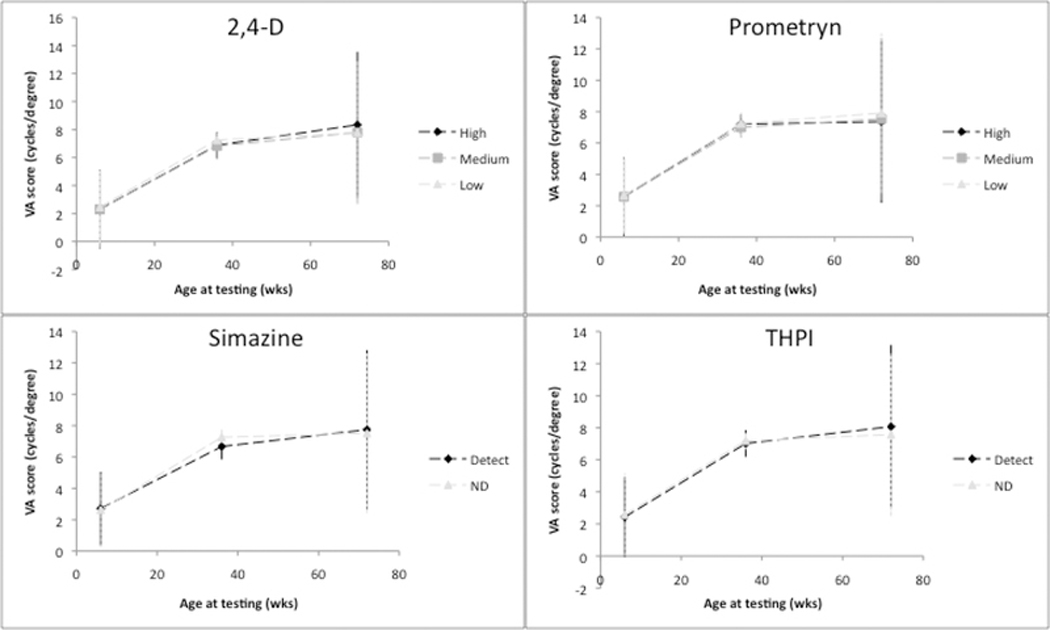 9 herbicides and 13 fungicides were measured in umbilical cord blood plasma from a cohort of infants in Fuyang County, China (n=232). Grating VA and ABR latencies for waves I, III, V were measured at 3 time points: 6 weeks, 9 months, and 18 months. Outcomes included VA score, ABR wave V latency and ABR central conduction time (CCT [wave V- wave I]). Pesticides were analyzed as 3- level ordinal (non-detect [ND]/medium/high), or dichotomous (ND/detect), depending on detection rates. Linear mixed models were used to evaluate relations between pesticides and VA and ABR outcomes.