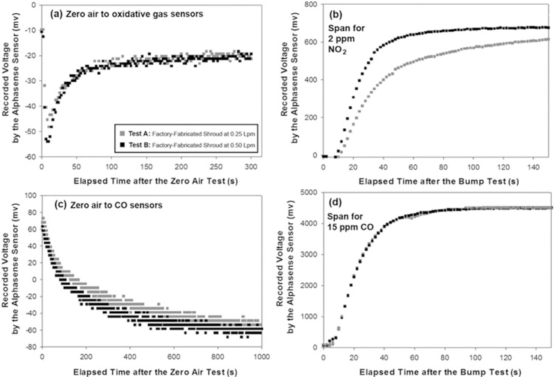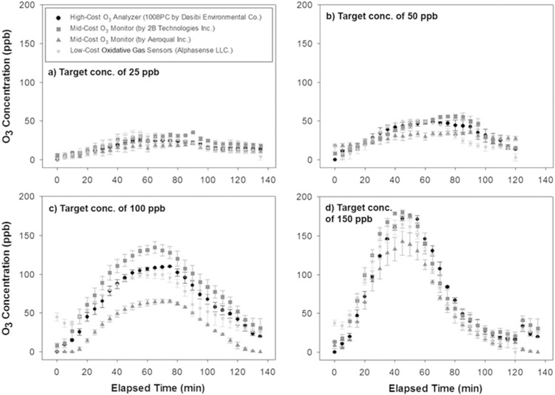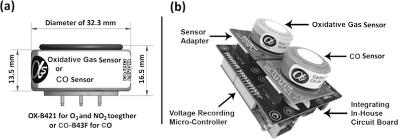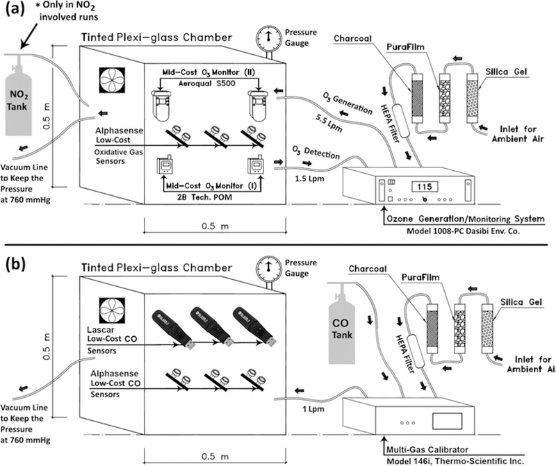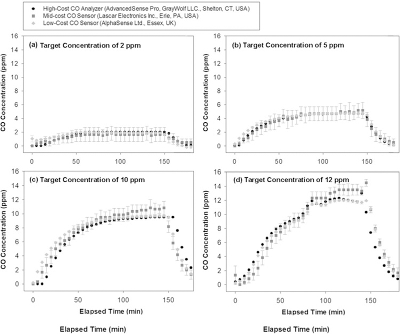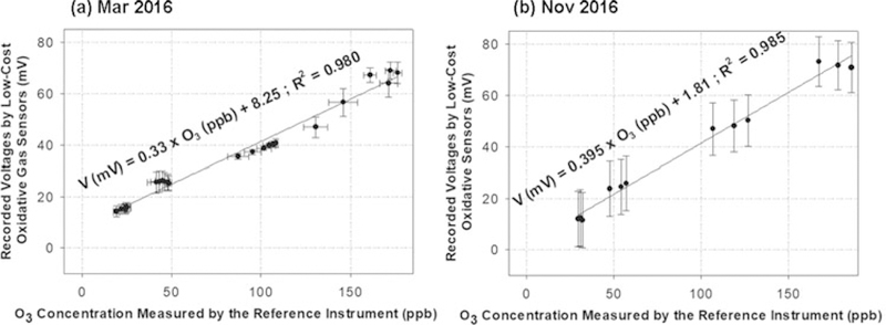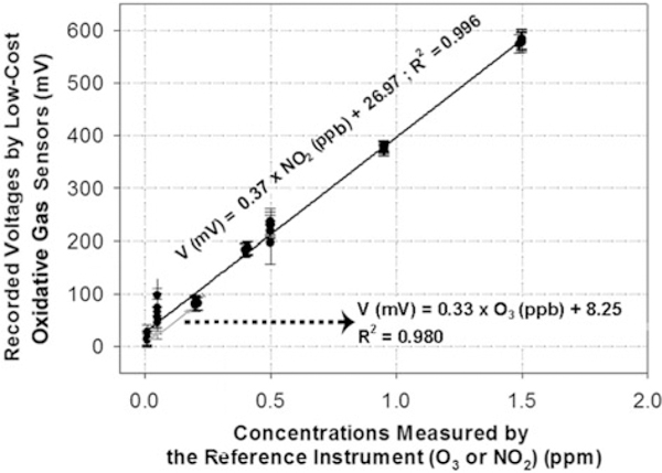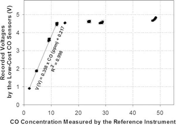 Description:Development of an air quality monitoring network with high spatio-temporal resolution requires installation of a large number of air pollutant monitors. However, state-of-the-art monitors are costly and may not be compatible with wireless data logging systems. In this study, low-cost electro-chemical sensors manufactured by Alphasense Ltd. for detection of CO and oxidative gases (predominantly O| and NO|) were evaluated. The voltages from three oxidative gas sensors and three CO sensors were recorded every 2.5 sec when exposed to controlled gas concentrations in a 0.125-m| acrylic glass chamber. Electro-chemical sensors for detection of oxidative gases demonstrated sensitivity to both NO| and O| with similar voltages recorded when exposed to equivalent environmental concentrations of NO| or O| gases, when evaluated separately. There was a strong linear relationship between the recorded voltages and target concentrations of oxidative gases (R| > 0.98) over a wide range of concentrations. Although a strong linear relationship was also observed for CO concentrations below 12 ppm, a saturation effect was observed wherein the voltage only changes minimally for higher CO concentrations (12-50 ppm). The nonlinear behavior of the CO sensors implied their unsuitability for environments where high CO concentrations are expected. Using a manufacturer-supplied shroud, sensors were tested at 2 different flow rates (0.25 and 0.5 Lpm) to mimic field calibration of the sensors with zero air and a span gas concentration (2 ppm NO2 or 15 ppm CO). As with all electrochemical sensors, the tested devices were subject to drift with a bias up to 20% after 9 months of continuous operation. Alphasense CO sensors were found to be a proper choice for occupational and environmental CO monitoring with maximum concentration of 12 ppm, especially due to the field-ready calibration capability. Alphasense oxidative gas sensors are usable only if it is valuable to know the sum of the NO| and O| concentrations.