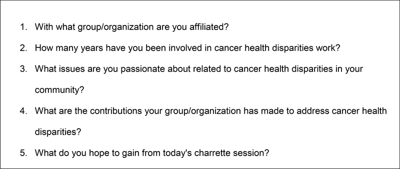 Fourteen CHAMPS community, academic, and medical partners participated in the CBPR charrette. Two co-facilitators guided the charrette application process and in-person discussion of partnership strengths, needs, and challenges. Community and academic experts with extensive experience in CBPR and health disparities provided technical assistance and recommendations during the in-person charrette.