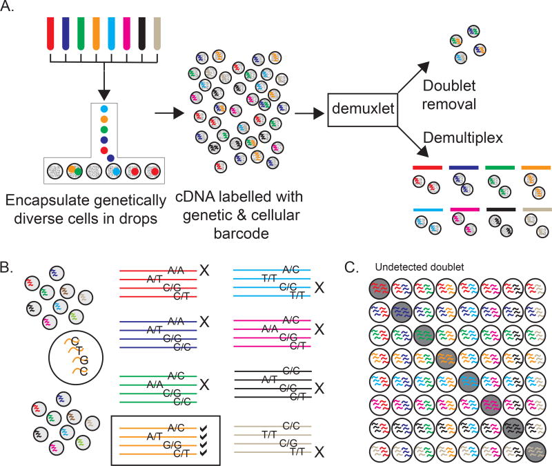 Description:Droplet single-cell RNA-sequencing (dscRNA-seq) has enabled rapid, massively parallel profiling of transcriptomes. However, assessing differential expression across multiple individuals has been hampered by inefficient sample processing and technical batch effects. Here we describe a computational tool, demuxlet, that harnesses natural genetic variation to determine the sample identity of each droplet containing a single cell (singlet) and detect droplets containing two cells (doublets). These capabilities enable multiplexed dscRNA-seq experiments in which cells from unrelated individuals are pooled and captured at higher throughput than in standard workflows. Using simulated data, we show that 50 single-nucleotide polymorphisms (SNPs) per cell are sufficient to assign 97% of singlets and identify 92% of doublets in pools of up to 64 individuals. Given genotyping data for each of eight pooled samples, demuxlet correctly recovers the sample identity of >99% of singlets and identifies doublets at rates consistent with previous estimates. We apply demuxlet to assess cell-type-specific changes in gene expression in 8 pooled lupus patient samples treated with interferon (IFN)-β and perform eQTL analysis on 23 pooled samples.