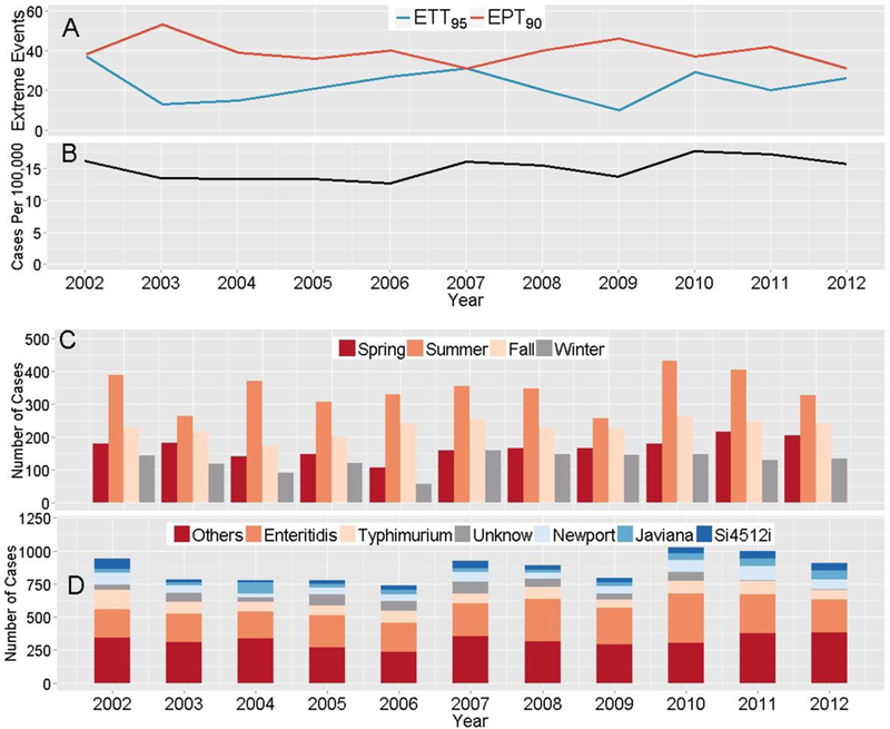 We obtained Salmonella case data from the Maryland Foodborne Diseases Active Surveillance Network (2002–2012), and weather data from the National Climatic Data Center (1960–2012). We developed exposure metrics related to extreme temperature and precipitation events using a 30 year baseline (1960–1989) and linked them with county-level salmonellosis data. Data were analyzed using negative binomial Generalized Estimating Equations.