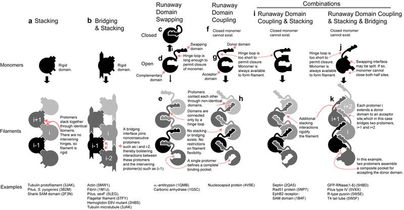 Description:Self-assembly of proteins into filaments, such as actin and tubulin filaments, underlies essential cellular processes in all three domains of life. The early emergence of filaments in evolutionary history suggests that filament genesis might be a robust process. Here we describe the fortuitous construction of GFP fusion proteins that self-assemble as fluorescent polar filaments in Escherichia coli. Filament formation is achieved by appending as few as 12 residues to GFP. Crystal structures reveal that each protomer donates an appendage to fill a groove between the two following protomers along the filament. This exchange of appendages resembles runaway domain swapping but is distinguished by higher efficiency because monomers cannot competitively bind their own appendages. Ample evidence for this 'runaway domain coupling' mechanism in nature suggests it could facilitate the evolutionary pathway from globular protein to polar filament, requiring a minimal extension of protein sequence and no substantial refolding.