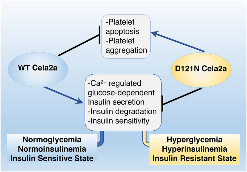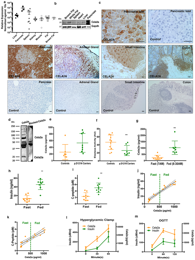 Description:Factors that underlie the clustering of metabolic syndrome traits are not fully known. We performed whole-exome sequence analysis in kindreds with extreme phenotypes of early-onset atherosclerosis and metabolic syndrome, and identified novel loss-of-function mutations in the gene encoding the pancreatic elastase chymotrypsin-like elastase family member 2A (CELA2A). We further show that CELA2A is a circulating enzyme that reduces platelet hyperactivation, triggers both insulin secretion and degradation, and increases insulin sensitivity. CELA2A plasma levels rise postprandially and parallel insulin levels in humans. Loss of these functions by the mutant proteins provides insight into disease mechanisms and suggests that CELA2A could be an attractive therapeutic target.