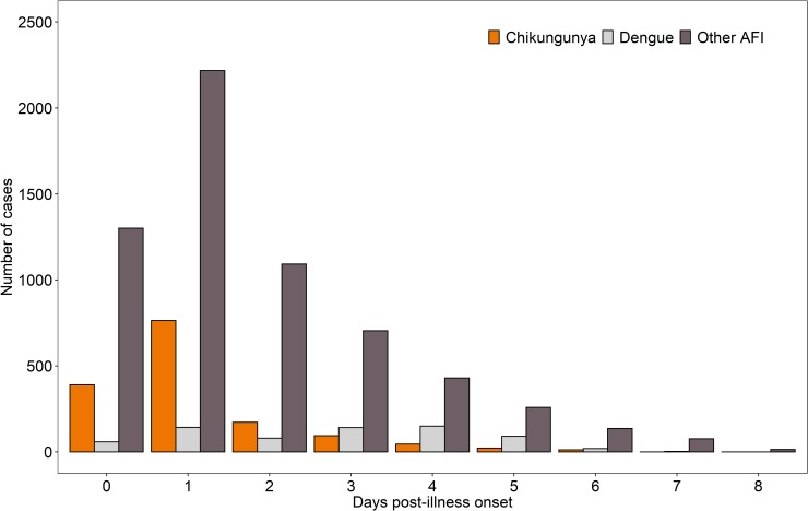 Description:Chikungunya, a mosquito-borne viral, acute febrile illness (AFI) is associated with polyarthralgia and polyarthritis. Differentiation from other AFI is difficult due to the non-specific presentation and limited availability of diagnostics. This 3-year study identified independent clinical predictors by day post-illness onset (DPO) at presentation and age-group that distinguish chikungunya cases from two groups: other AFI and dengue. Specimens collected from participants with fever ≤7 days were tested for chikungunya, dengue viruses 1-4, and 20 other pathogens. Of 8,996 participants, 18.2% had chikungunya, and 10.8% had dengue. Chikungunya cases were more likely than other groups to be older, report a chronic condition, and present <3 DPO. Regardless of timing of presentation, significant positive predictors for chikungunya versus other AFI were: joint pain, muscle, bone or back pain, skin rash, and red conjunctiva; with dengue as the comparator, red swollen joints (arthritis), joint pain, skin rash, any bleeding, and irritability were predictors. Chikungunya cases were less likely than AFI and dengue to present with thrombocytopenia, signs of poor circulation, diarrhea, headache, and cough. Among participants presenting <3 DPO, predictors for chikungunya versus other AFI included: joint pain, skin rash, and muscle, bone or back pain, and absence of thrombocytopenia, poor circulation and respiratory or gastrointestinal symptoms; when the comparator was dengue, joint pain and arthritis, and absence of thrombocytopenia, leukopenia, and nausea were early predictors. Among all groups presenting 3-5 DPO, pruritic skin became a predictor for chikungunya, joint, muscle, bone or back pain were no longer predictive, while arthritis became predictive in all age-groups. Absence of thrombocytopenia was a significant predictor regardless of DPO or comparison group. This study identified robust clinical indicators such as joint pain, skin rash and absence of thrombocytopenia that can allow early identification of and accurate differentiation between patients with chikungunya and other common causes of AFI.