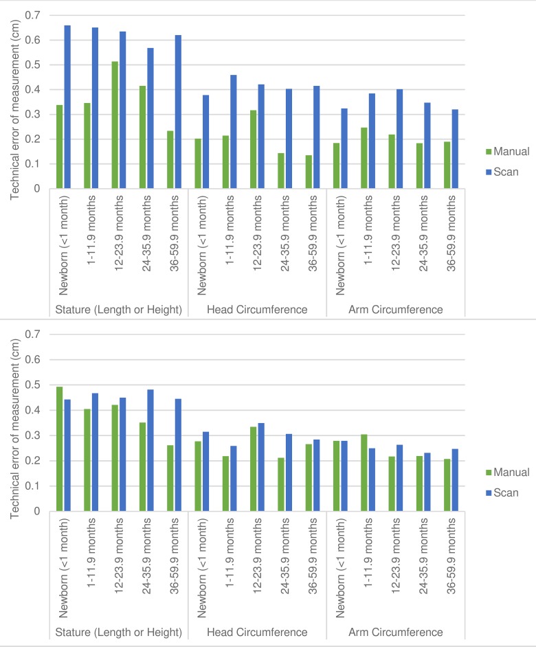 Description:The usefulness of anthropometry to define childhood malnutrition is undermined by poor measurement quality, which led to calls for new measurement approaches. We evaluated the ability of a 3D imaging system to correctly measure child stature (length or height), head circumference and arm circumference. In 2016-7 we recruited and measured children at 20 facilities in and around metro Atlanta, Georgia, USA; including at daycare, higher education, religious, and medical facilities. We selected recruitment sites to reflect a generally representative population of Atlanta and to oversample newborns and children under two years of age. Using convenience sampling, a total of 474 children 0-5 years of age who were apparently healthy and who were present at the time of data collection were included in the analysis. Two anthropometrists each took repeated manual measures and repeated 3D scans of each child. We evaluated the reliability and accuracy of 3D scan-derived measurements against manual measurements. The mean child age was 26 months, and 48% of children were female. Based on reported race and ethnicity, the sample was 42% Black, 28% White, 8% Asian, 21% multiple races, other or race not reported; and 16% Hispanic. Measurement reliability of repeated 3D scans was within 1 mm of manual measurement reliability for stature, head circumference and arm circumference. We found systematic bias when analyzing accuracy-on average 3D imaging overestimated stature and head circumference by 6 mm and 3 mm respectively, and underestimated arm circumference by 2 mm. The 3D imaging system used in this study is reliable, low-cost, portable, and can handle movement; making it ideal for use in routine nutritional assessment. However, additional research, particularly on accuracy, and further development of the scanning and processing software is needed before making policy and clinical practice recommendations on the routine use of 3D imaging for child anthropometry.