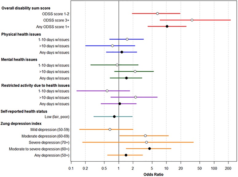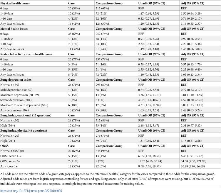 Median age at time of acute neurologic onset was 49 years (range, 10–80); 17 (50%) were male. No deaths occurred. At long-term follow-up, 25 (73%) patients had a HDS 0–1, indicating complete / near complete recovery. Among the group, HDS (mean 1.4, range 0–4), ODSS (mean 1.9, range 0–9) and ZDS score (mean 34.4, range 20–56) indicated mild / moderate ongoing disability. Adjusting for age and sex, Zika virus-associated GBS cases were similar to a population comparison group (n = 368) in Barranquilla without GBS in terms of prevalence of physical or mental health complaints, though GBS patients were more likely to have an ODSS of ≥ 1 (OR 8.8, 95% CI 3.2–24.5) and to suffer from moderate / moderate-severe depression (OR 3.89, 95% CI 1.23–11.17) than the comparison group.